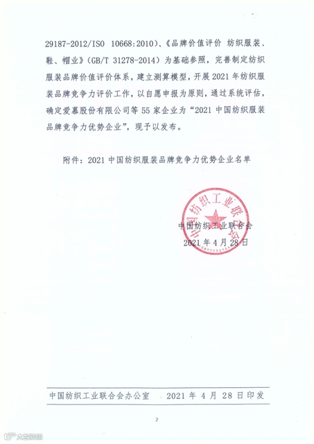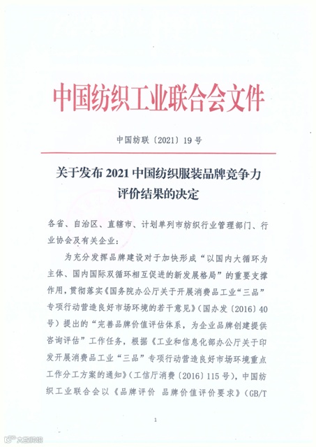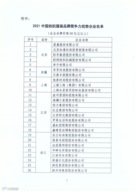 热点聚焦 | “2021中国纺织服装品牌竞争力优势企业”名单发布