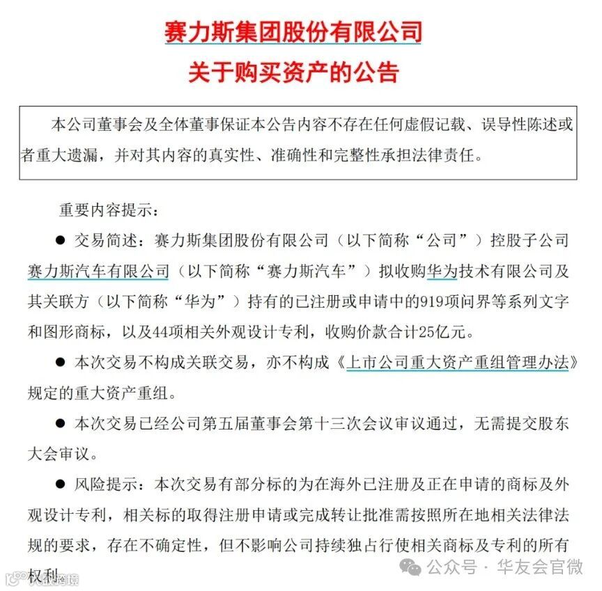 2024年7月2日晚间,赛力斯集团公司发布公告,赛力斯集团股份有限公司控股子公司赛力斯汽车有限公司拟收购华为技术有限公司及其关联方持有的已注册或申请中的919项AITO问界等系列文字和图形商标,以及44项相关外观设计专利,收购价款总计为25亿元。