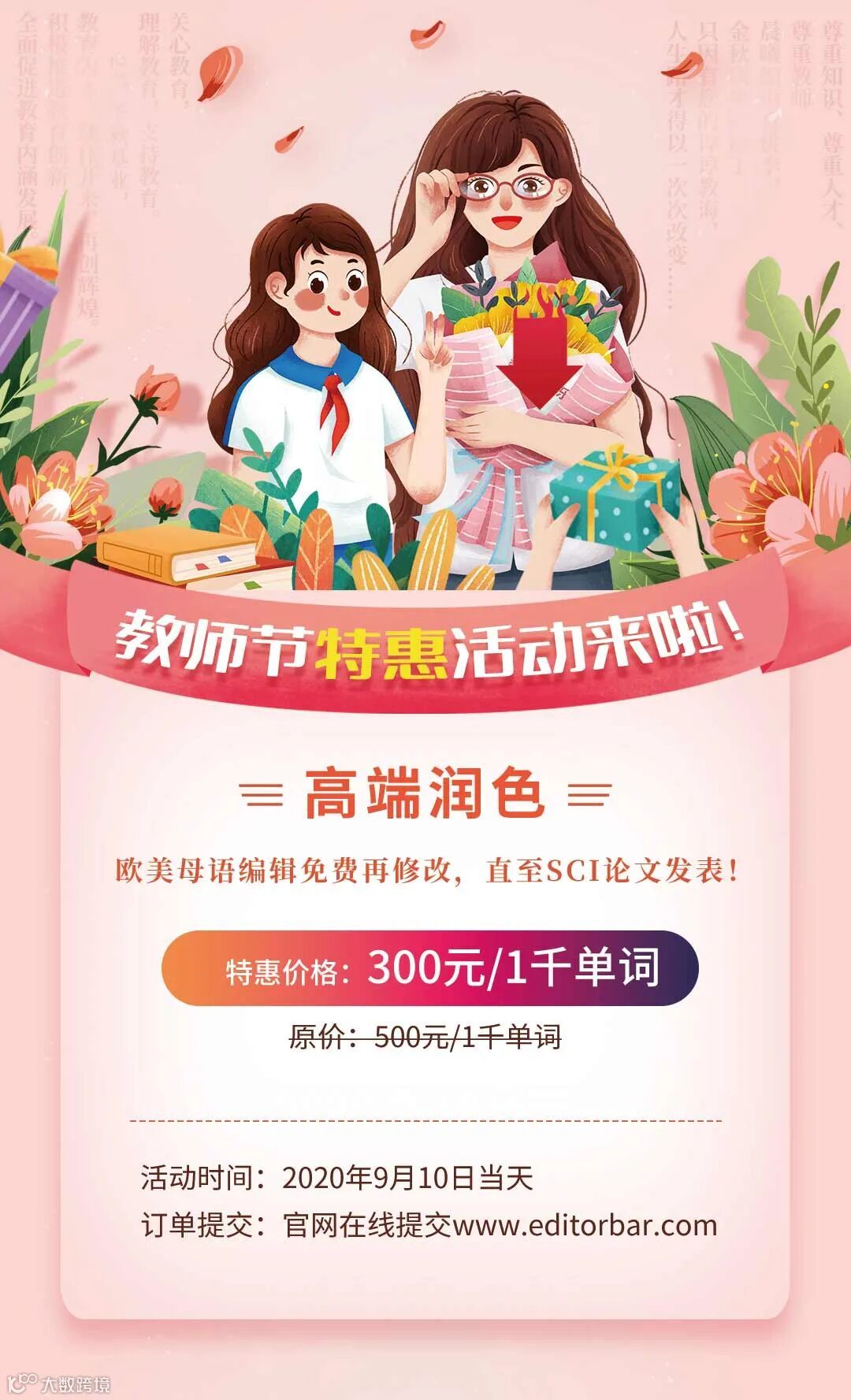 北京艾迪润色预祝您教师节快乐!十年树木,十载风,十载雨,十万栋梁,为回馈广大师恩,教师节期间北京艾迪润色推出特惠活动。