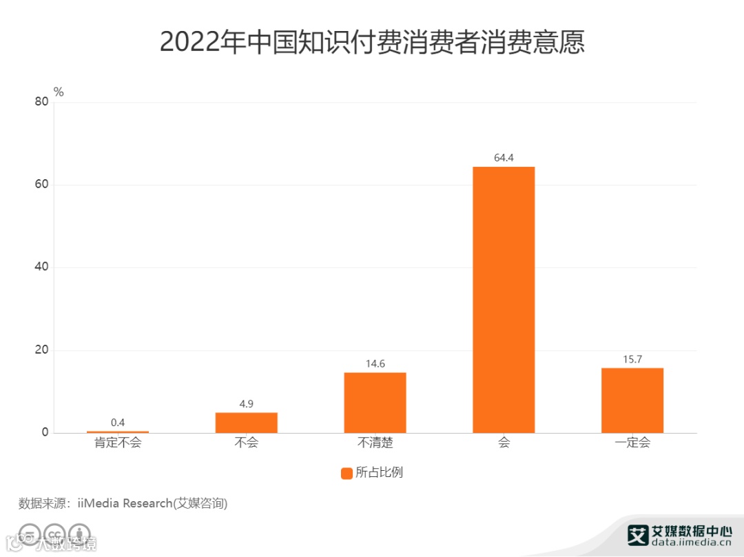 如今,市面上的知识付费产品呈现出多样化态势,这些平台在一定程度上能够为消费者提供优质的知识内容服务,为消费者在学习新事物、解决实际问题、排解孤独、丰富生活等方面提供帮助。艾媒数据中心(data.iimedia.cn)显示,2022年有超八成的受访者表示有明确的知识付费消费意愿。
