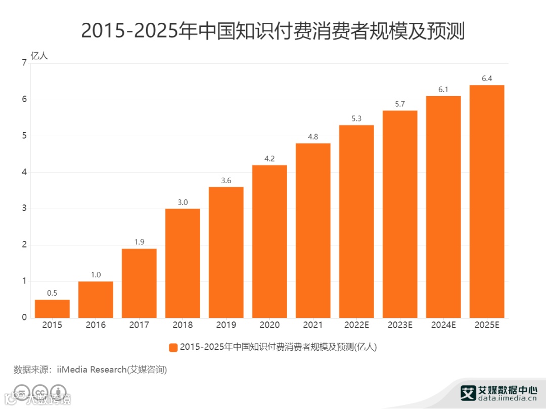 而在感到焦虑的情况下,付费知识的出现为消费者们提供了一个突破口,成为了消费者们的“自救”宝典。艾媒数据中心(data.iimedia.cn)显示,近年来中国知识付费消费者规模呈稳健上升态势,预计2022年将达5.3亿人,2025年将达6.4亿人。