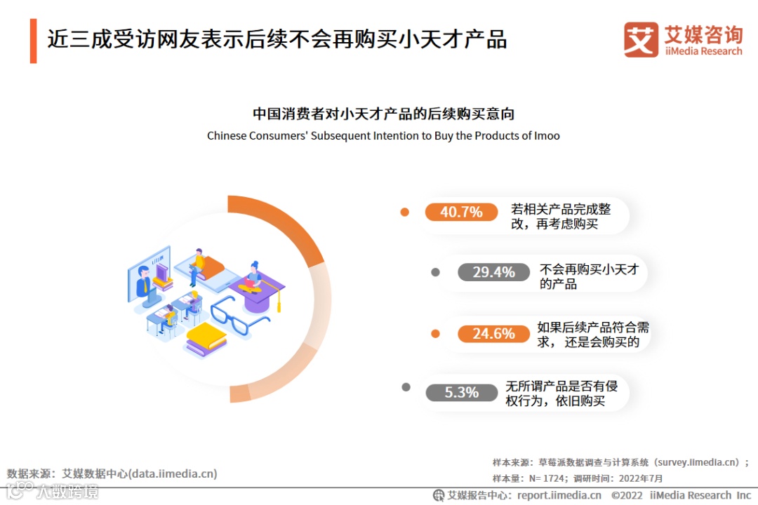 调研数据显示,有29.4%的受访网友表示不会再购买小天才品牌的产品。有40.7%的受访网友表示,如果相关产品完成整改,还是会考虑购买。艾媒咨询分析师认为,此事发生后,大部分受访网友对后续购买小天才的产品产生动摇,这对小天才品牌无疑是一次巨大的冲击。