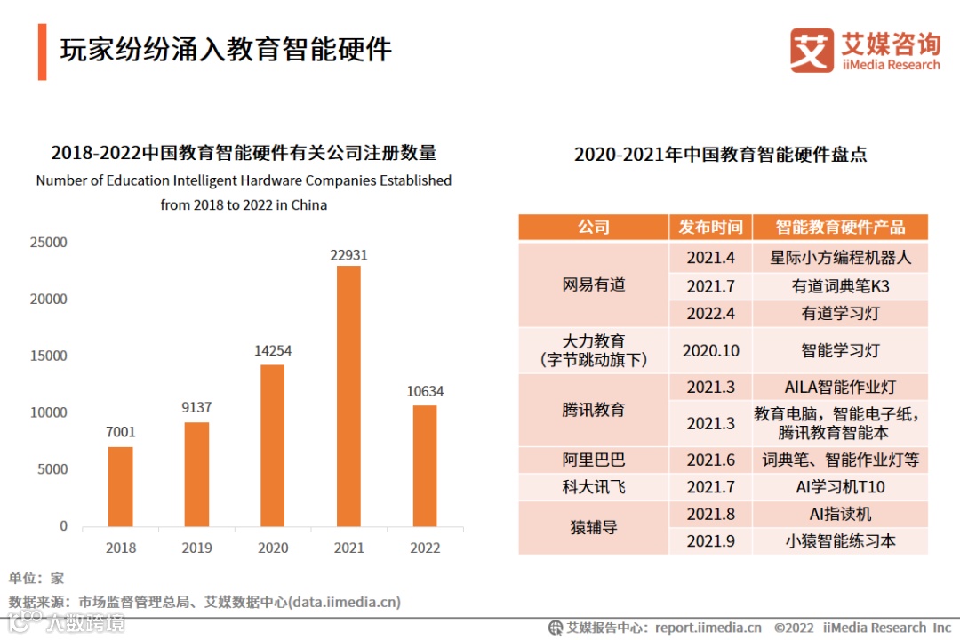 随着“双减” 政策出台,主打K12学科辅导的教培行业一落千丈,相关企业纷纷开始转型,其中大批企业转向了教育智能硬件领域。根据数据显示,2018-2021年中国教育智能硬件相关公司注册量逐年增长,2021年同比增长60.9%。头部互联网企业(如字节跳动、阿里巴巴),K12转型公司(如猿辅导、好未来),以及传统教育硬件厂商(如小天才、读书郎),三类玩家在教育智能硬件领域激烈竞争。