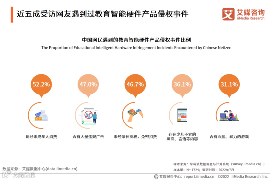 调研数据显示,有52.2%的受访网友遇到过教育智能硬件产品诱导未成年人消费的情况,47.0%的受访网友遇到过含有大量违规广告的情况,还有46.7%的受访网友遇到过未经家长授权就免密扣费的情况。艾媒咨询分析师认为,侵权现象普遍存在于教育智能硬件行业,消费者对此存在不满。