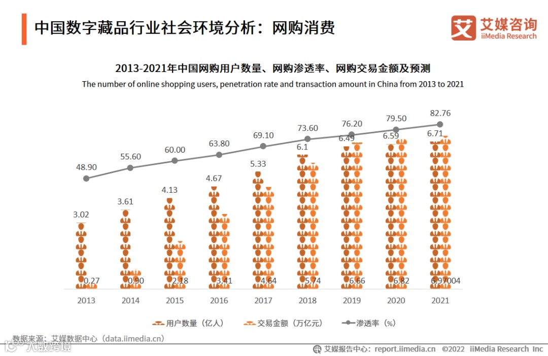 随着互联网普及程度的提高,中国网购用户数量、网购渗透率、网购交易金额每年均稳定增长。2021年中国网购用户数量达6.71亿人,网购渗透率将达82.76%,交易金额将达6.97万亿元。艾媒咨询分析师认为,随着中国电子商务市场向着更加成熟的高质量发展迈进,数字藏品行业也将得到进一步的发展。