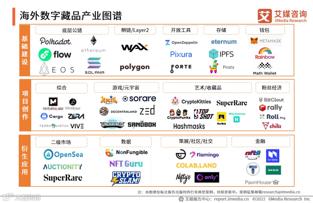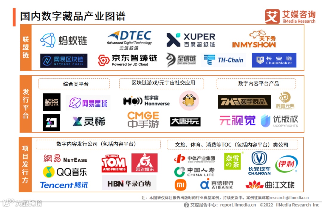 另一方面,数字藏品产业吸引了众多企业参与,海外形成了如opensea等数字藏品平台,国内形成了如数藏中国、iBox、元视觉等垂直数字藏品平台,并且谷歌、微软、阿里巴巴、腾讯、哔哩哔哩等典型平台也开始介入数字藏品产业。