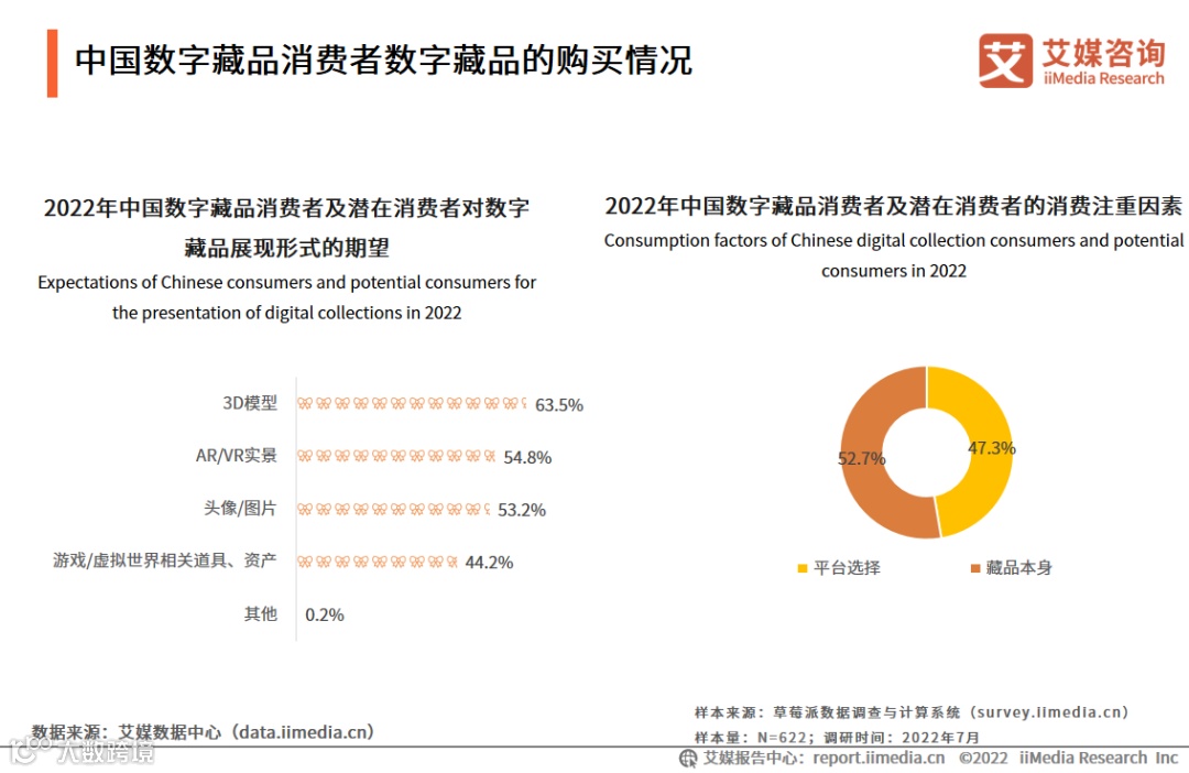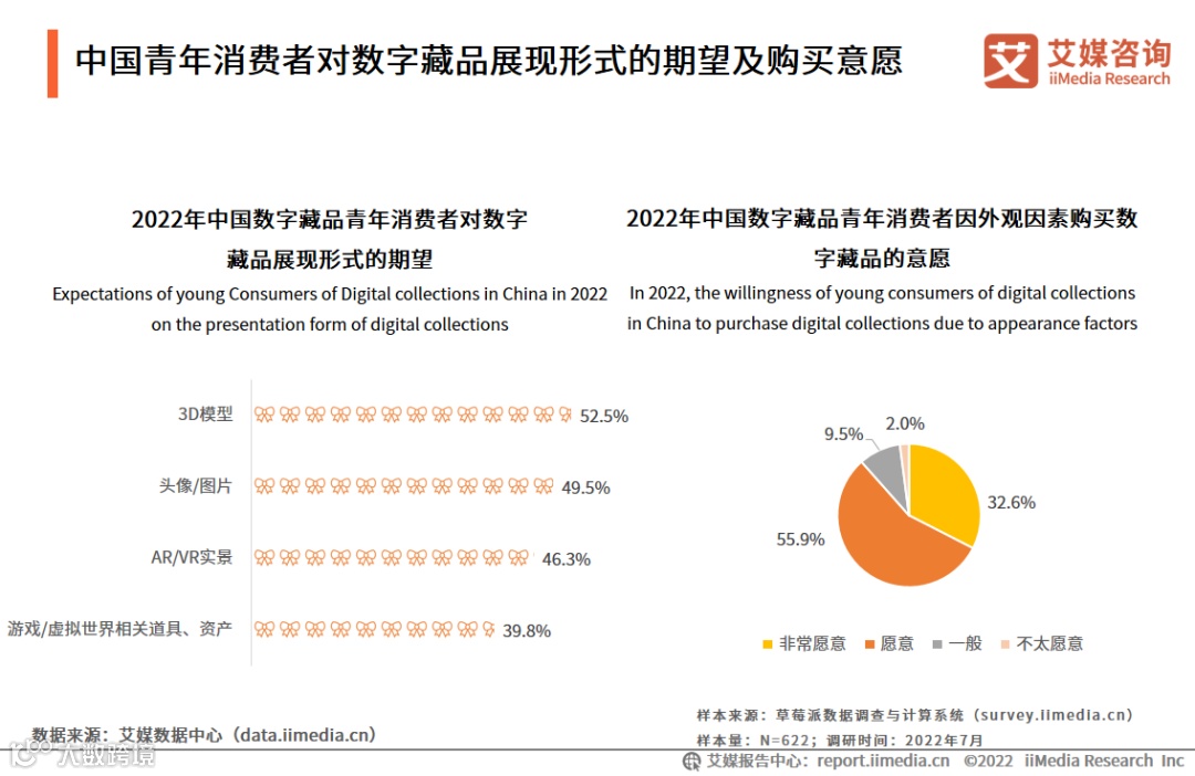 iiMedia Research(艾媒咨询)调研数据显示,2022年的数字藏品消费者中,53.3%为青年群体。消费者愿意购买数字藏品主要为新颖好奇(57.7%)、看中未来升值(57.6%)、具有收藏价值(52.9%)等因素。青年消费者中,女性群体比例略高(62.2%),面对数字藏品时主要持有追求特定IP(68.9%)的态度。