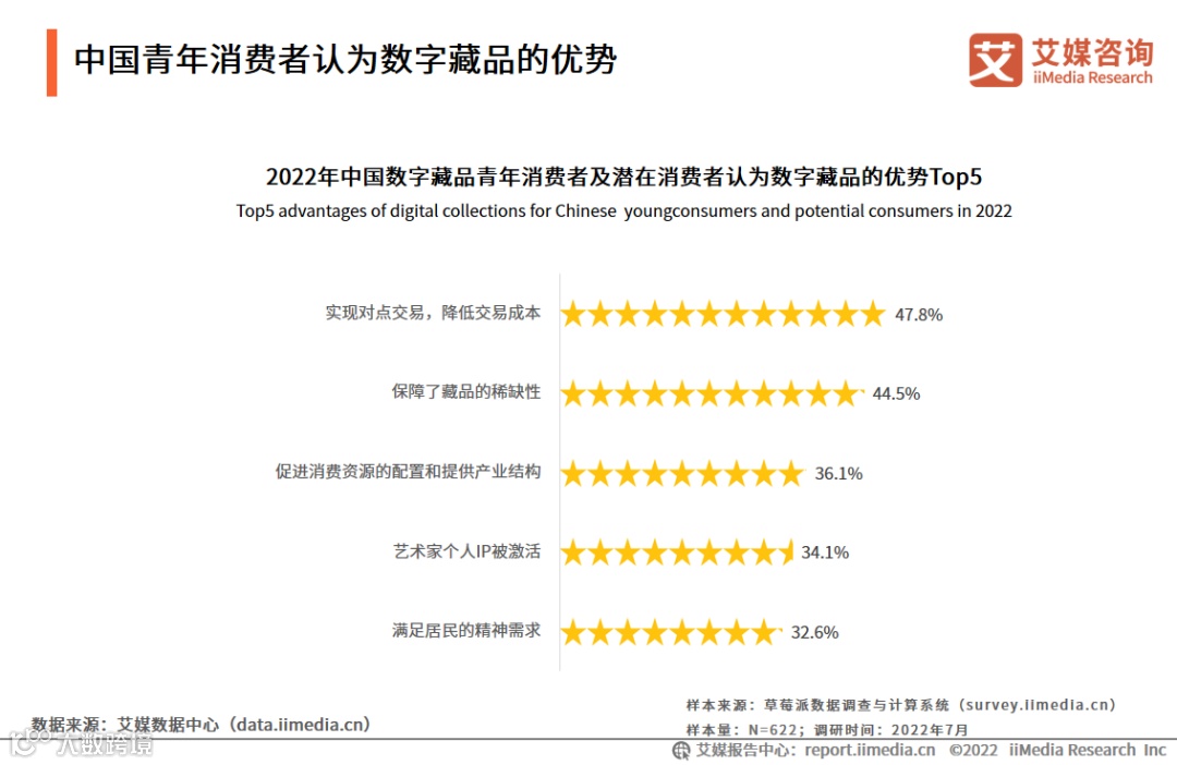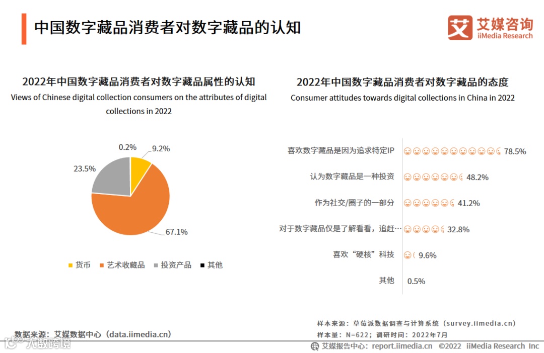iiMedia Research(艾媒咨询)调研数据显示,数字藏品更吸引青年消费者,在2022年的数字藏品消费者中,53.3%为青年群体,其中,35.8%的青年消费者以黑科技的态度对待数字藏品。