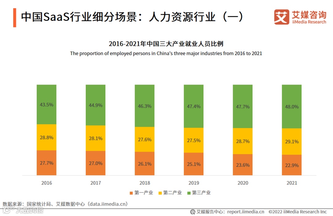 数据显示,2021年全国就业人员中,第一产业就业人员占22.9%,第二产业就业人员占29.1%,第三产业就业人口比例较高,占48.0%。第三产业具有人才密集、人员流动速度快等特点,使用HR SaaS平台能够更有效率的进行人员管理。