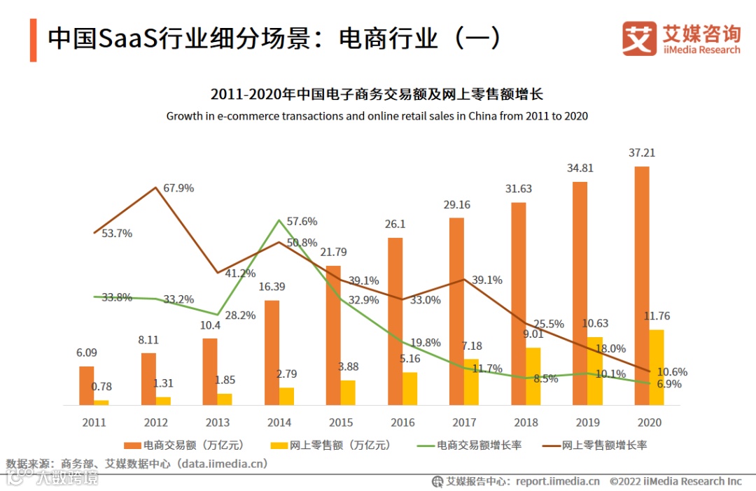 数据显示,2020年中国电商交易额为37.21万亿元,同比增长率为6.9%,网上零售额为11.76万亿元,同比增长率为10.6%。受疫情影响,消费者线下购物行为受阻,互联网成为主要购物渠道,消费习惯逐渐转移到线上,提升了电商渗透率,从而推动了电商SaaS这一电商配套服务业的发展。