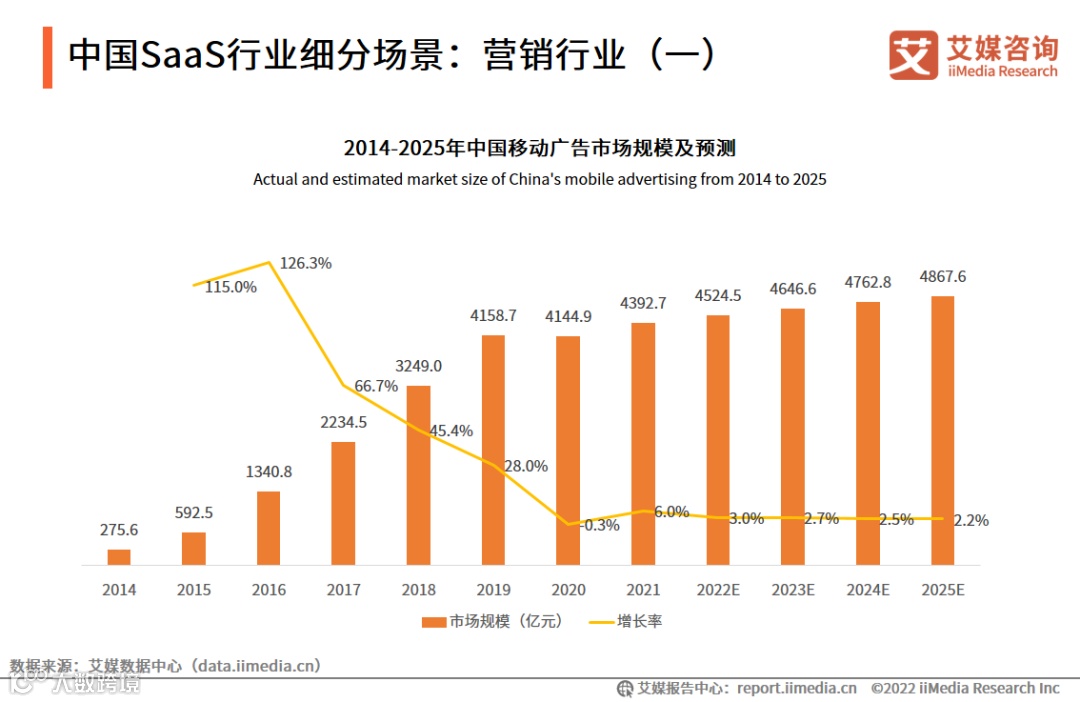 iiMedia Research(艾媒咨询)数据显示,中国移动广告市场增长速度放缓,2021年中国移动广告市场规模为4392.7亿元,预计2025年将突破4800亿元。艾媒咨询分析师认为,移动广告行业在市场快速增长后,却面临发展瓶颈,存在投放效果不突出等问题。但在整体向好经济环境下,广告主营销投放需求仍然强烈,且目前市场头部企业综合实力较强,移动广告行业总体还是呈上升态势。