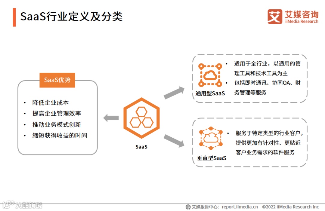 SaaS通过网络提供软件服务。SaaS提供商为企业搭建信息化所需要的所有网络基础设施及软件、硬件运作平台,并负责提供所有前期的实施、后期的维护等一系列服务,企业无需购买软硬件、建设机房、招聘IT人员,即可通过互联网使用信息系统。SaaS的优势有降低企业成本、提高企业管理效率、推动业务模式创新、缩短获得收益时间。目前,SaaS主要分为通用型SaaS和垂直型SaaS两类。