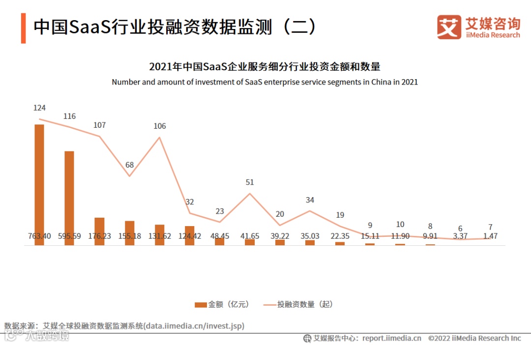 图表5:2021年中国SaaS企业服务细分行业投资金额和数量