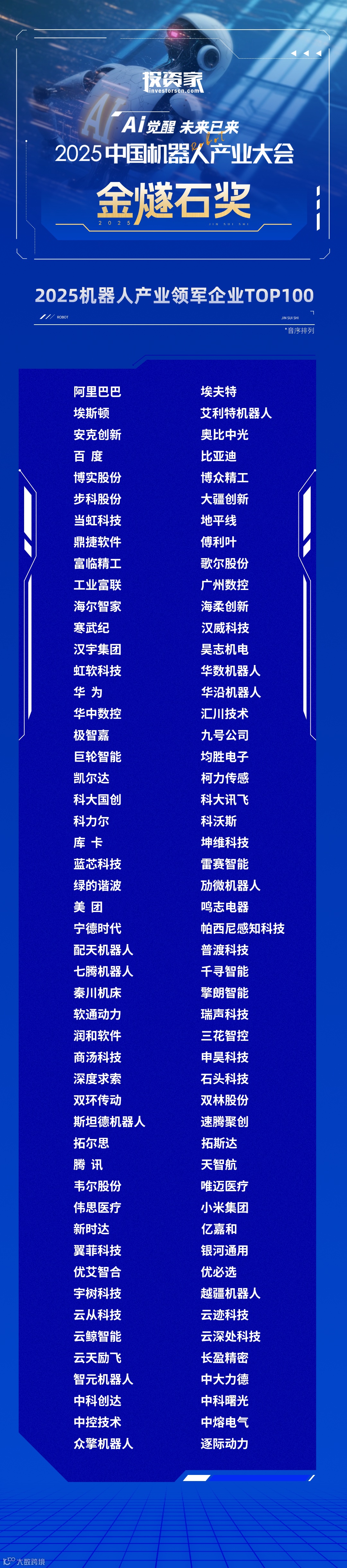 投资家网旗下投资家研究院在大会期间发布“2025机器人产业大会·金燧石奖”,挖掘出机器人产业勇于挑战险阻、奋发图强的企业以及创新者。华芯鲲鹏邀你一同回顾榜单,“投资家网2025机器人产业大会·金燧石奖”获得者名单如下: