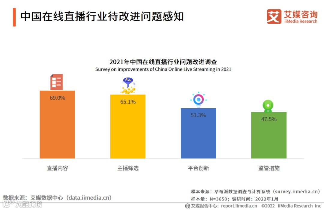 调研数据显示, 69.0%的在线直播用户认为直播内容的问题需要改进,65.1%的用户觉得主播筛选机制仍有改进的空间。直播内容、个人主播均作为在线直播行业必不可少的部分,其直播内容质量以及个人主播素质的高低在很大程度上决定了直播行业发展的好坏,因此,各大直播平台应该加大对内容监管以及主播筛选方面的改进力度。