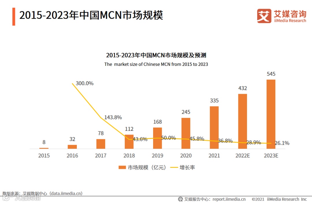 近年来中国MCN市场规模迅速扩大,2021年市场规模已超过330亿元,预计2023年将超过500亿元。艾媒咨询分析师认为,以直播电商为代表的新兴网红经济的崛起,使MCN机构的服务需求持续增长。
