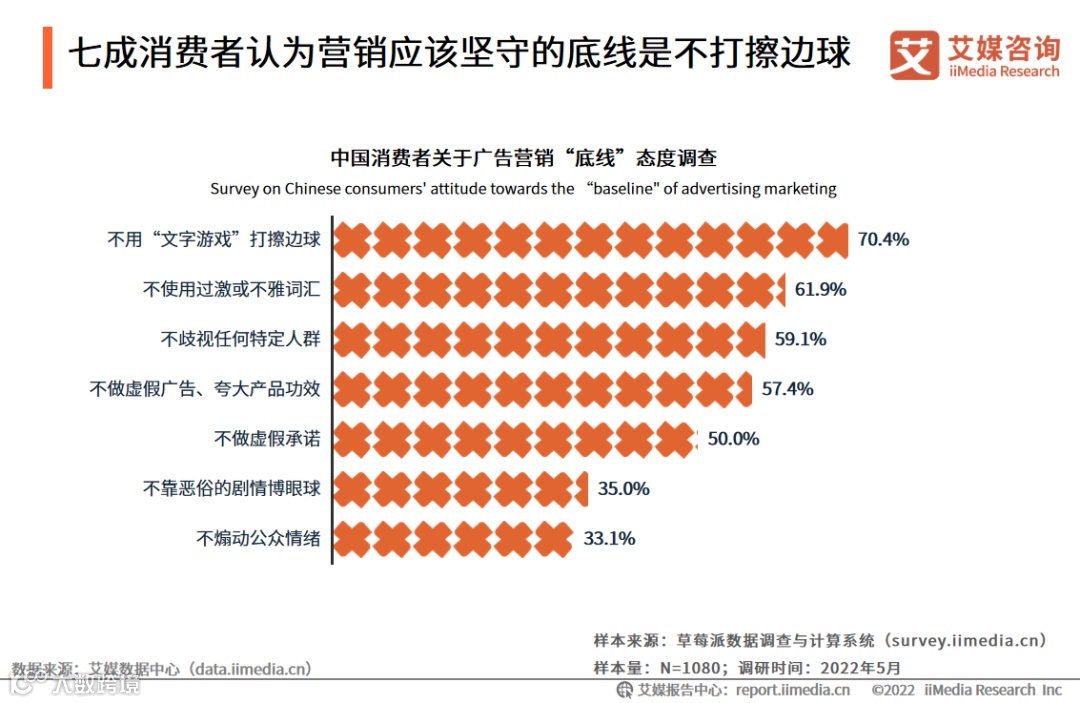 艾媒咨询调查发现,约七成的受访者表示品牌营销的底线是不用“文字游戏”打擦边球;超过六成的消费者认为底线是不使用过激或不雅词汇;还有近六成的受访者觉得不歧视特定人群是广告的底线。而妇炎洁此次营销同时存在了恶俗文字“擦边球”、不雅词汇、冒犯女性群体等情况,难怪惹来众怒。