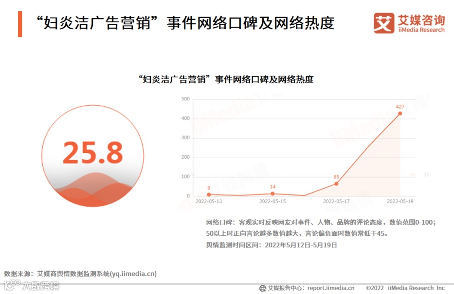 上周, 妇炎洁营销“翻车”,广告文案被指有侮辱女性之嫌,引来全网声讨。艾媒咨询就此事进行了舆情监测,数据显示,大部分网友对该事件持负面态度,网络口碑指数低至25.8。