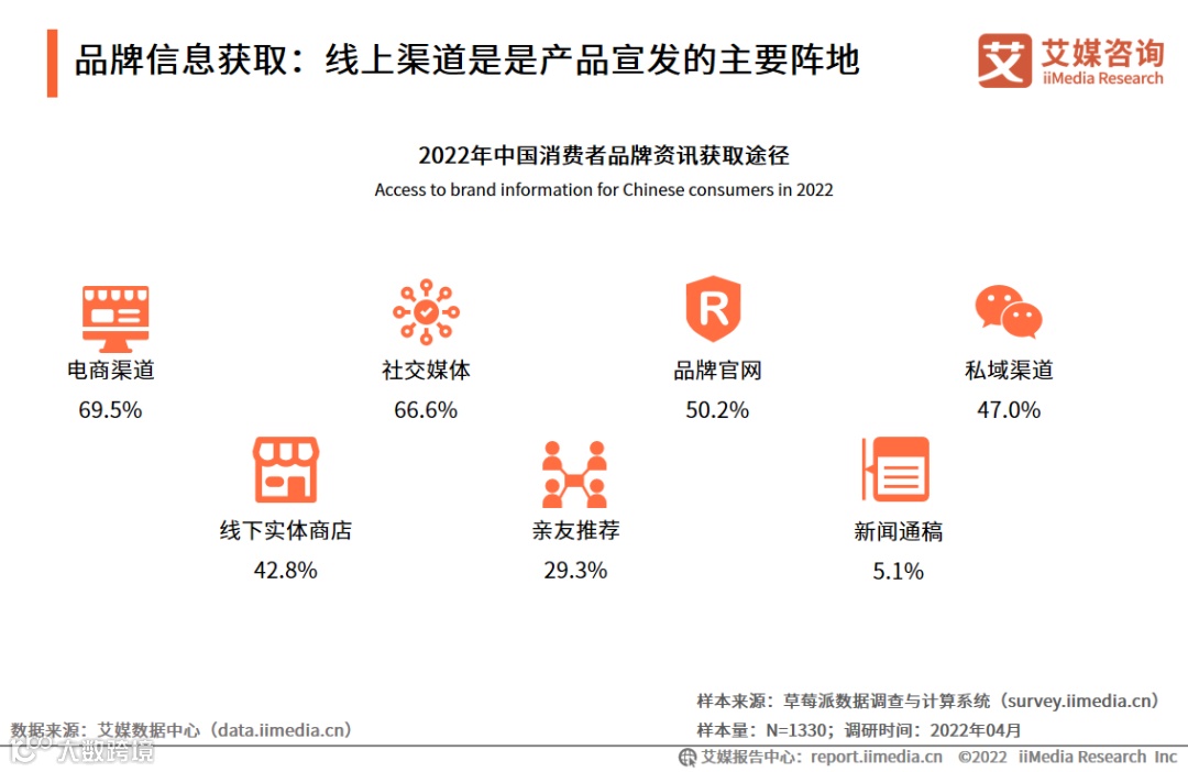 艾媒咨询调研数据显示,我国消费者获取品牌资讯的主要途径有电商渠道(69.5%)、社交媒体(66.6%)、品牌官网(50.2%)。另外,有42.8%的受访者表示会从线下实体店了解品牌信息。