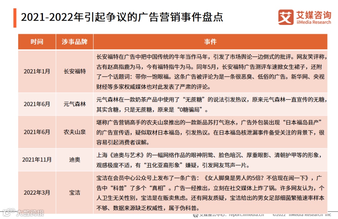 其实近年来,不妥当的广告营销不在少数。iiMedia Research(艾媒咨询)指出,2021年1月至今,长安福特、元气森林、农夫山泉、迪奥、宝洁等知名品牌就先后因为广告营销涉嫌低俗、欺骗、歧视而引发争议。