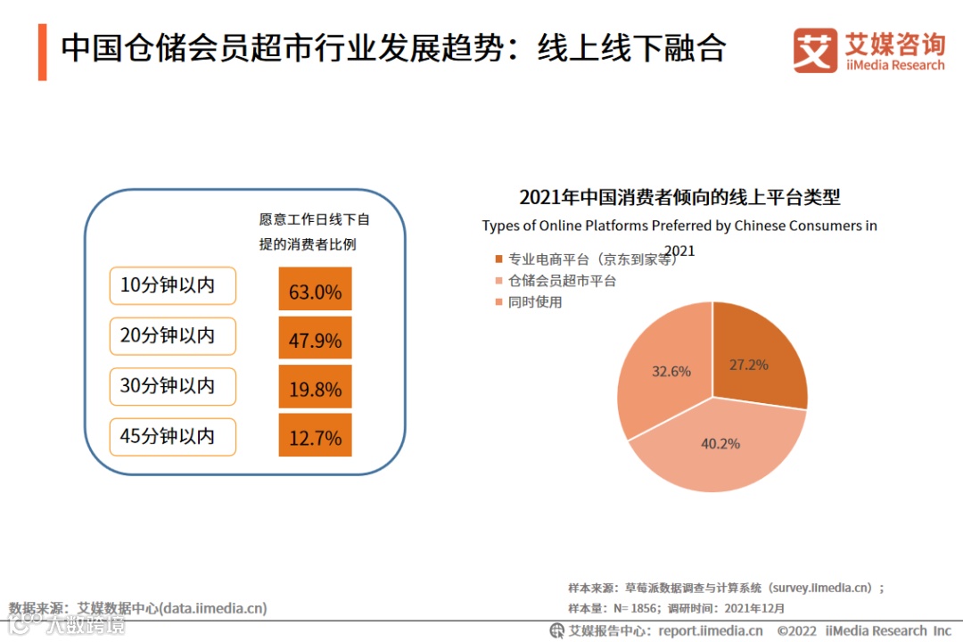 调研数据显示,在单程时间20分钟以上时,大部分消费者不愿意在工作日去仓储会员超市自提商品,而是选择线上下单,且消费者更倾向于仓储会员超市的线上平台而非专业电商平台。