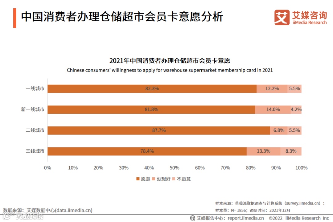 数据显示,超8成的一线、新一线、二线城市消费者愿意办理仓储超市会员卡,有近八成的三线城市消费者愿意办理仓储超市会员卡。