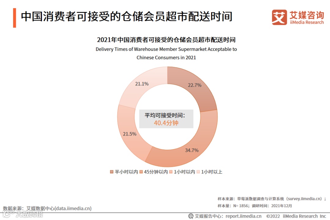 数据显示,分别有22.7%、34.7%和21.5%的中国消费者能够接受30分钟以内、45分钟以内和1个小时以内的仓储会员超市配送时间,平均可接受的配送时间为40.4分钟。