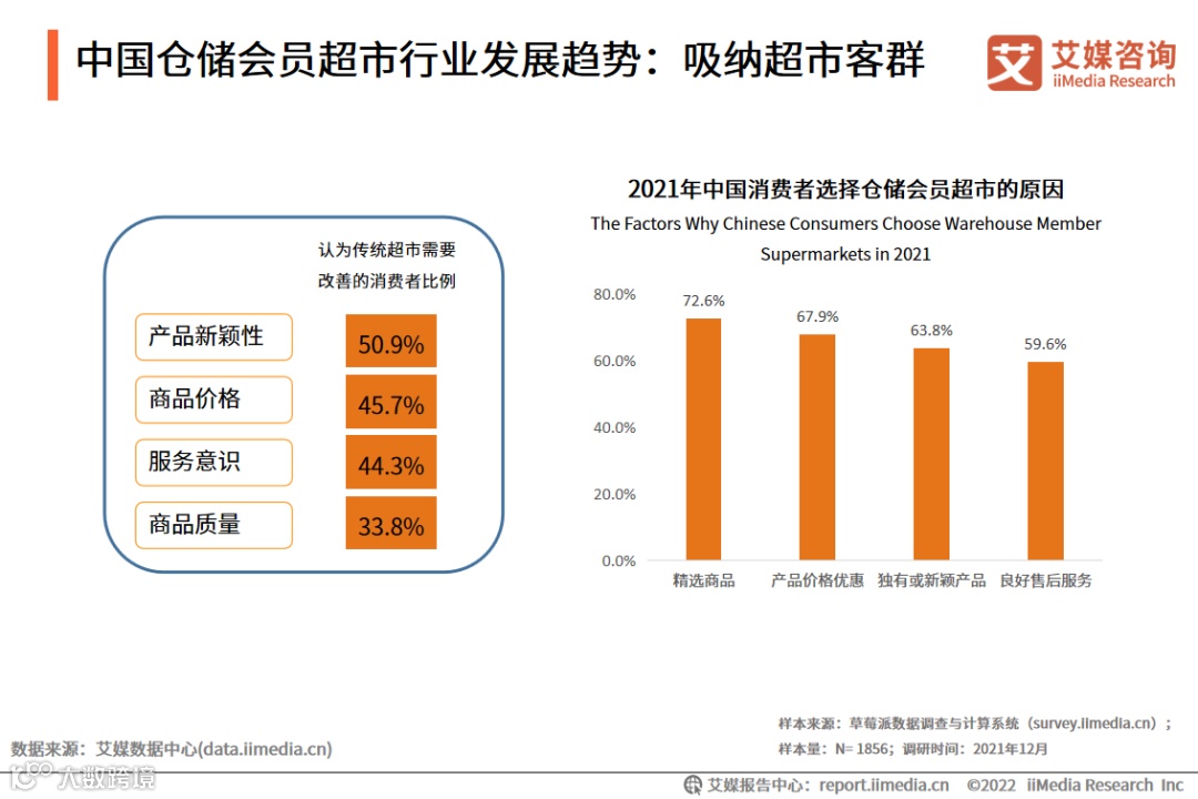 调研数据显示,中国消费者中有30%-50%认为传统超市在产品新颖性、商品价格、服务意识和商品质量上需要改善,而精选商品、产品价格优惠、独有或新颖产品及良好售后服务,正是仓储会员超市吸引消费者的主要原因。