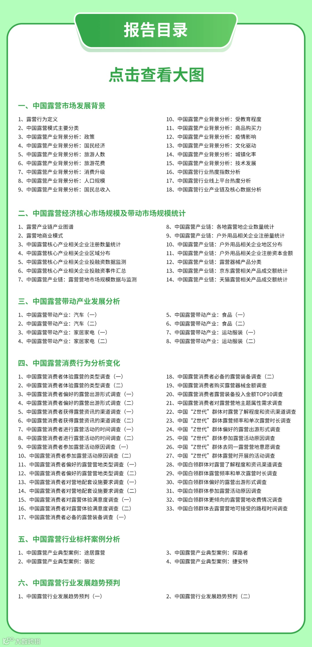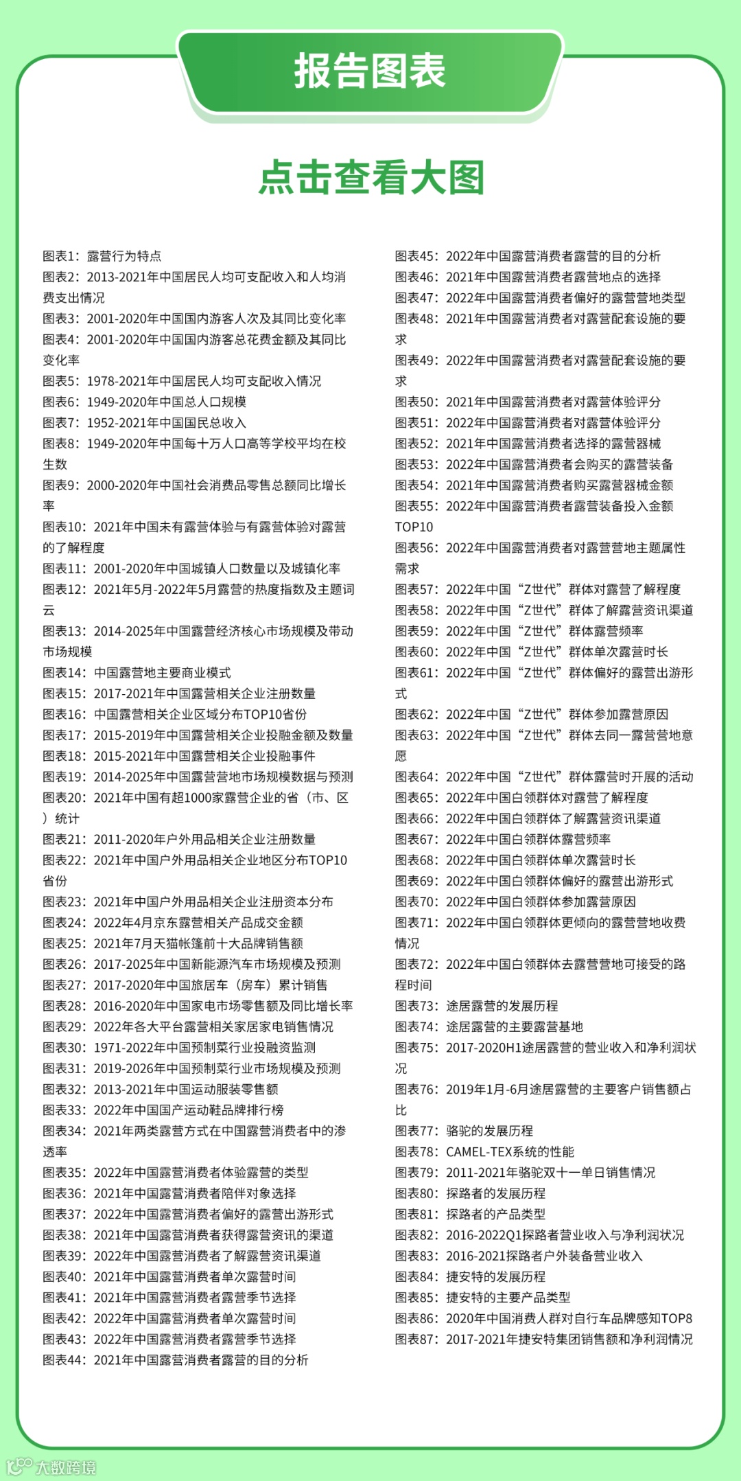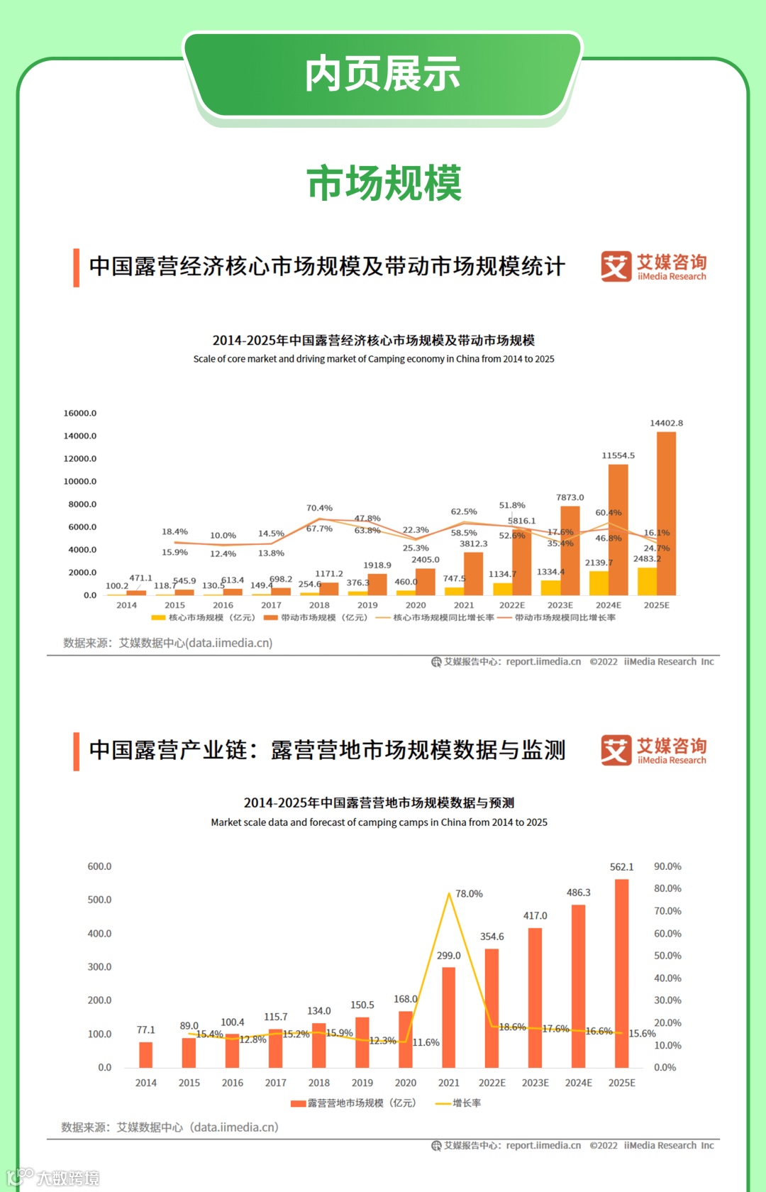 为了帮助企业深入行业,理清未来趋势,抓住发展机遇,艾媒咨询特推出《2022-2025年中国露营经济发展前景与商业布局分析报告》,114页精选内容,87张图表,覆盖露营经济背景分析、产业规模与产业链分析、带动产业分析、消费者行为洞察、典型案例分析、行业发展总结及趋势分析六大模块,剖析露营经济的行业机会,数据详实,观点独到,干货超多。