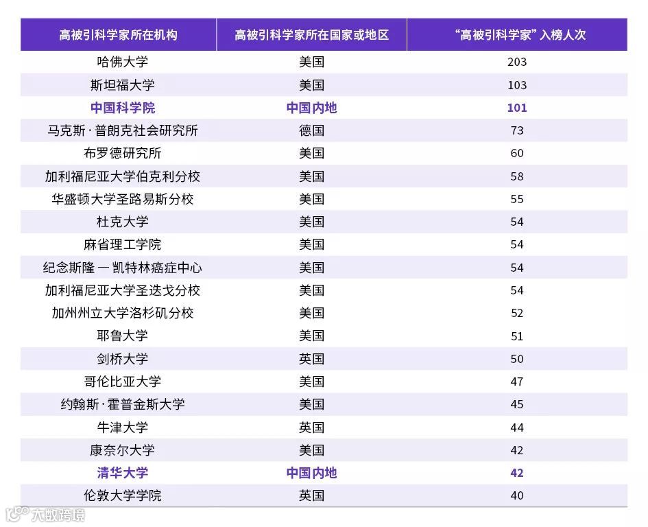 哈佛大学共有203人次上榜,是全球高被引科学家人数最多的机构。中国科学院和清华大学入榜高被引科学家所在机构榜前20名,分别位列第3名和第19名。