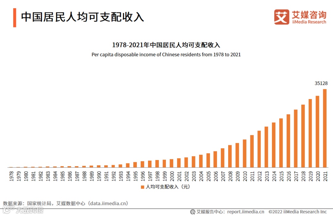 数据显示,中国居民人均可支配收入从1978年的171元增加到2021年的35128元,居民消费已从温饱型向享受型、发展型转变。