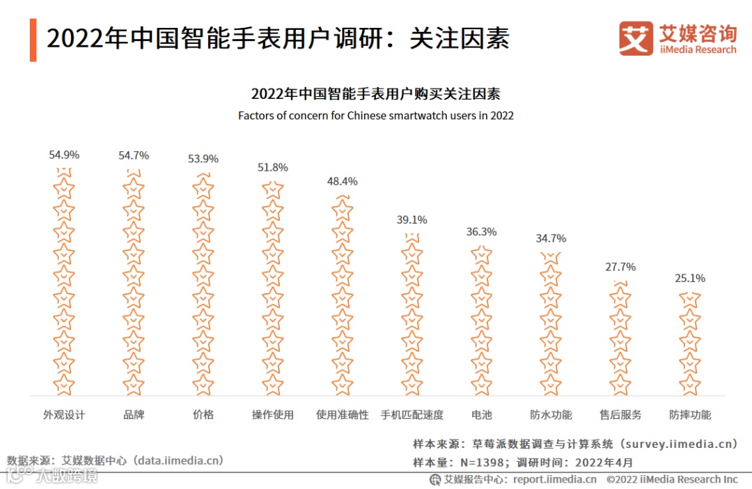 iiMedia Research(艾媒咨询)数据显示,在选购智能手表时,受访用户更加关注其外观设计、品牌、价格,分别占比54.9%、54.7%、53.9%。