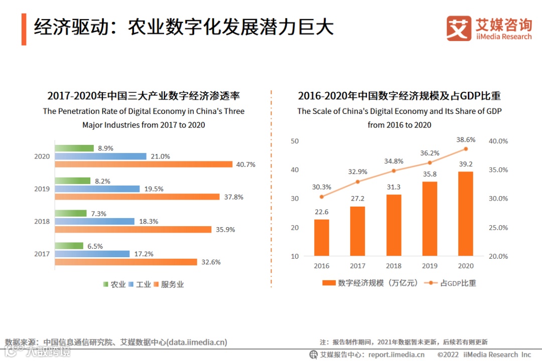 目前,我国在信息基础设施建设领域取得了长足发展,数字经济对产业及市场的渗透率已超过36%,但农业领域这一指标为8%,尚有巨大的发展空间。