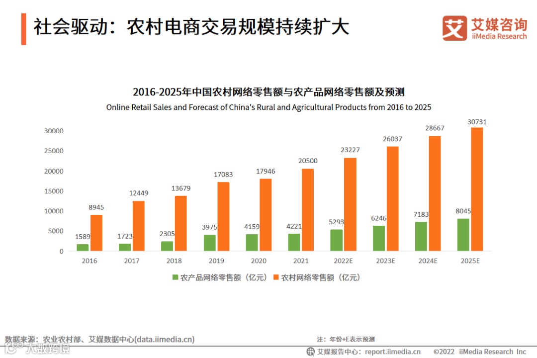 数据显示,2021年中国农产品网络零售额为4221亿元,2022年将达5293亿元,同比增长25.4%,预计2025年将突破8000亿元。