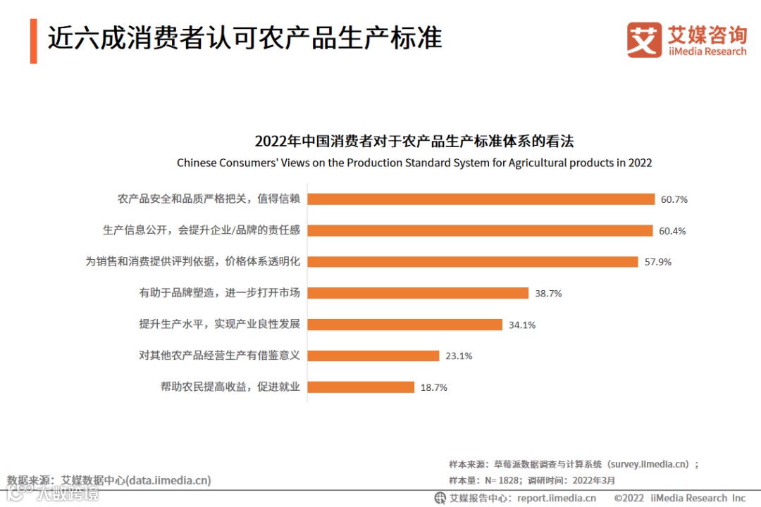 调研数据显示,对于农产品生产标准体系,近六成消费者认为其能够确保农产品安全和品质、促进价格体系透明化。