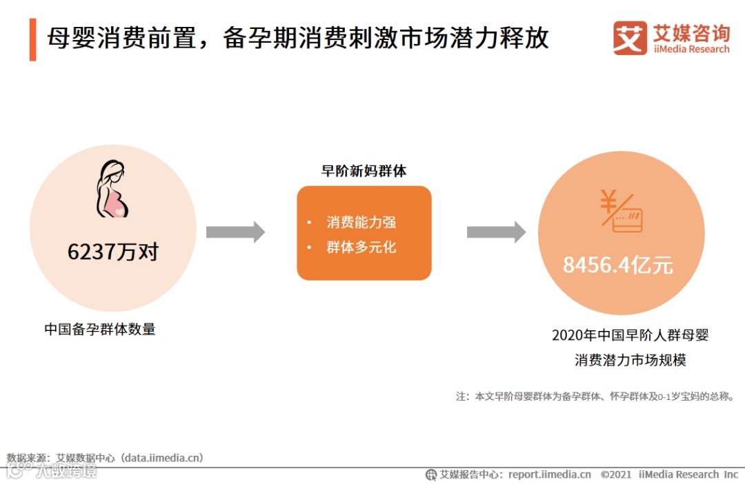 iiMedia Research(艾媒咨询)数据显示,目前中国备孕群体数量达到6237万对,随着早阶新妈群体的收入水平提升和消费能力提高,该群体的消费意识逐渐前置。此外,早阶母婴群体呈现多元化特点,高学历妈妈、职场妈妈规模不断壮大。