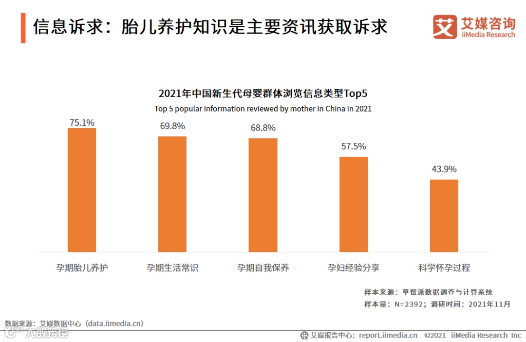 iiMedia Research(艾媒咨询)数据显示,新生代妈妈主要浏览的信息内容是孕期胎儿养护,占比75.1%;孕期生活常识和孕期自我保养分别占比69.8%和68.8%。