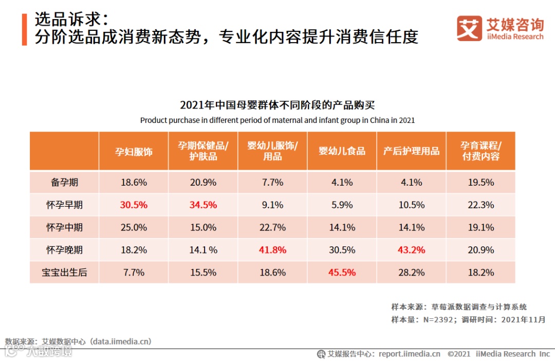 iiMedia Research(艾媒咨询)数据显示,在怀孕早期,母婴群体主要购买孕妇服饰和孕期保健品;在怀孕晚期,婴幼儿用品和产后护理用品受欢迎;婴幼儿食品的购买主要集中在宝宝出生后;孕育课程渗透各个阶段。