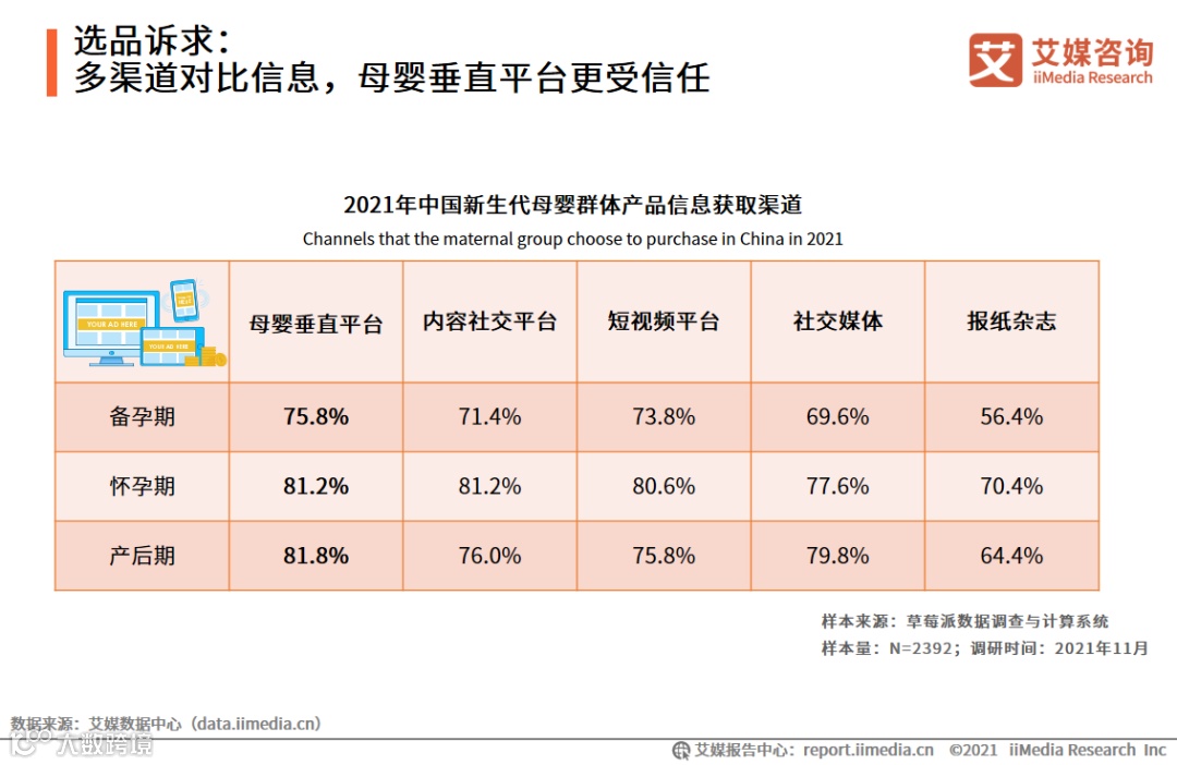 iiMedia Research(艾媒咨询)数据显示,母婴垂直平台是新生代母婴群体在不同孕育阶段的产品信息获取渠道。