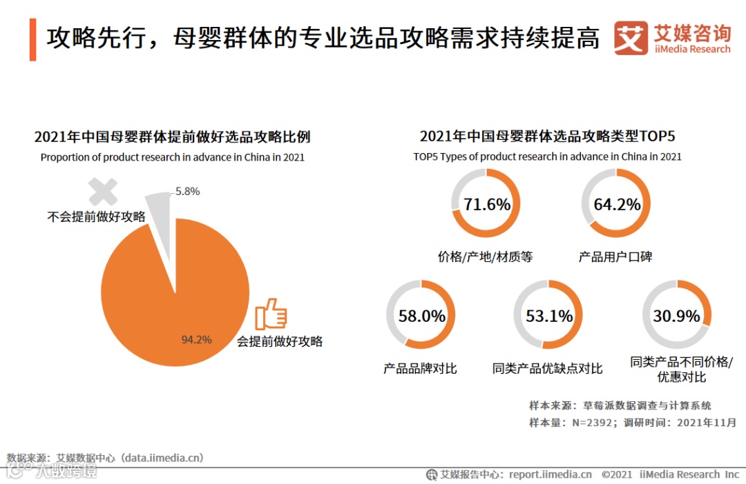 iiMedia Research(艾媒咨询)数据显示,超过九成(94.2%)的受访母婴群体会提前做好选品攻略;受访的母婴群体主要做产品的价格、产地、材质等基本属性的攻略,占比71.6%。