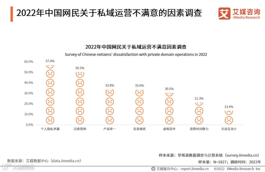 调研数据显示,57%的中国网民对私域运营不满意的因素是个人隐私泄露,50.3%的中国网民不满意因素是过度营销,其次是产品单一、信息骚扰和虚假宣传。