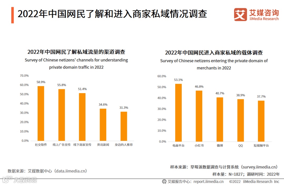 调研数据显示,2022年中国网民了解私域流量的渠道排名前三分别为社交软件、线上广告宣传和线下商家宣传,数据分别为58.9%、55.8%和51.4%;中国网民进入到商家私域最主要的载体是电商平台,占比为53.1%,其次是小红书(46.8%)、微博(40.7%)。