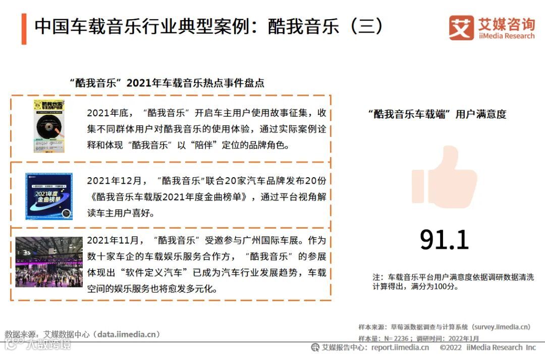 iiMedia Research(艾媒咨询)数据显示,酷我音乐车载端的用户满意度为91.1分。