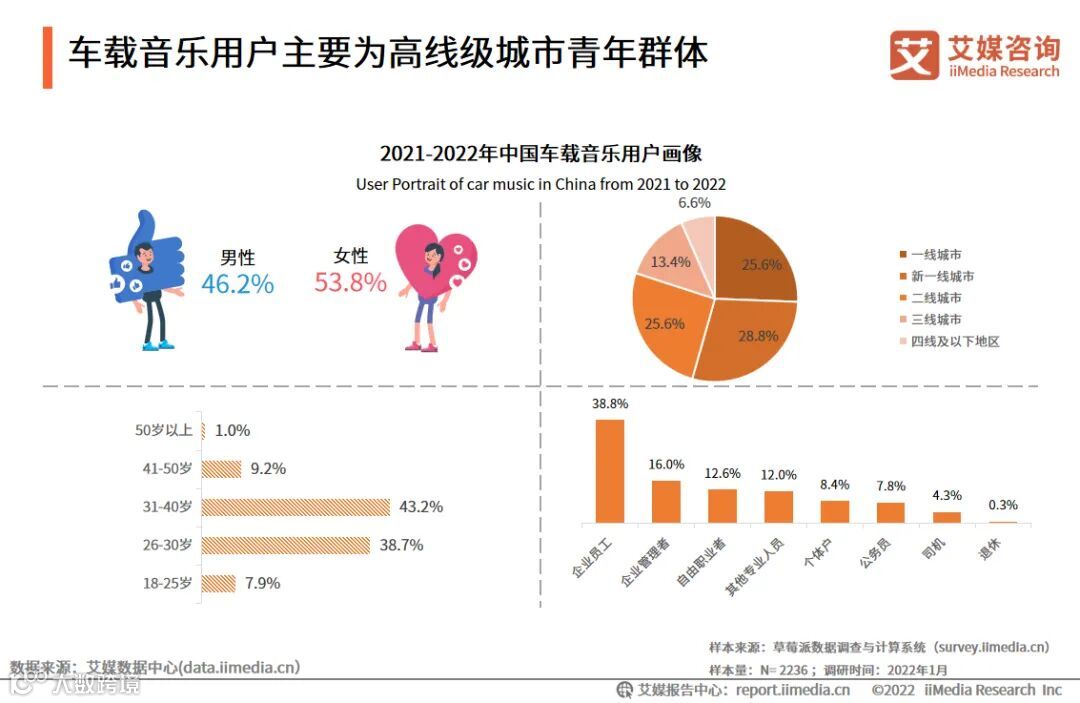 调研数据显示,40岁及以下青年群体是车载音乐的主要用户,占比近九成;二线及以上城市汽车保有量相对较高,用户分布比例超过八成。