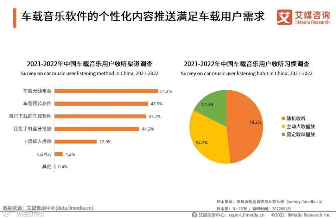 调研数据显示,车载无线电台和车载软件是用户收听车载音乐的主要渠道,近五成用户会选择随机收听内容。