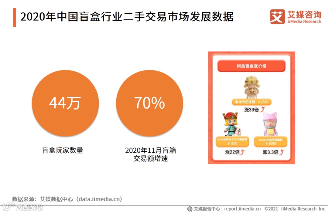 而盲盒玩家还有一大热衷的趋势,就是喜欢淘闲置或者二手盲盒。在二手电商闲鱼平台上,预计有至少44万的盲盒玩家,艾媒咨询的统计显示,“双11”所在11月份,闲置盲箱交易额突破1.2亿元,同比增长70%以上。