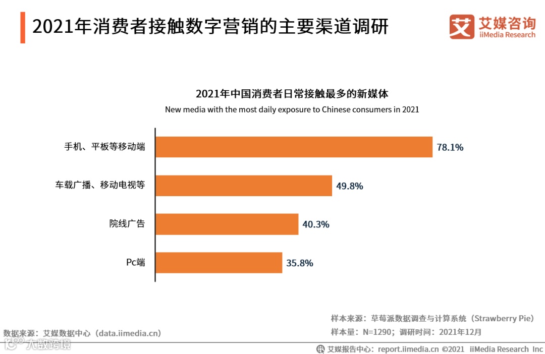 调研数据显示,中国消费者目前接触新媒体最受欢迎渠道为手机、平板等移动端(78.1%)。