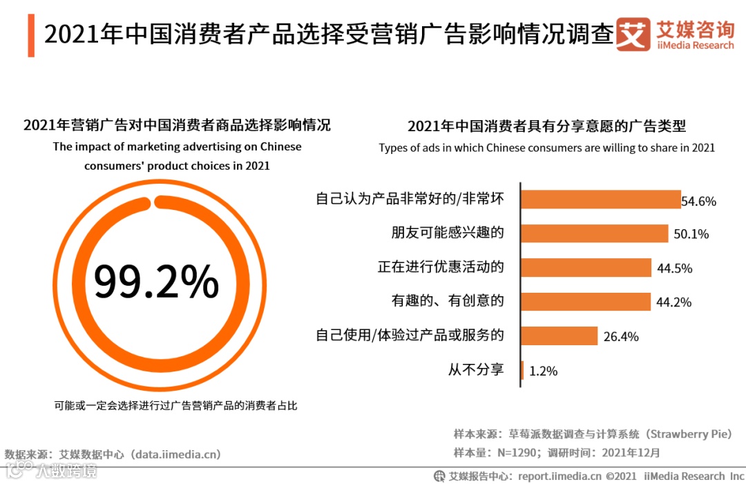 调研数据显示,参与调查的消费者中约99.2%消费者表示,选择同一种类的两种品牌商品时,将一定或可能优先选择其中进行过广告营销的商品。对于内容较为有趣的广告或使用体验较好产品的广告,消费者更倾向将其分享给朋友,从而实现广告宣传效果的裂变。