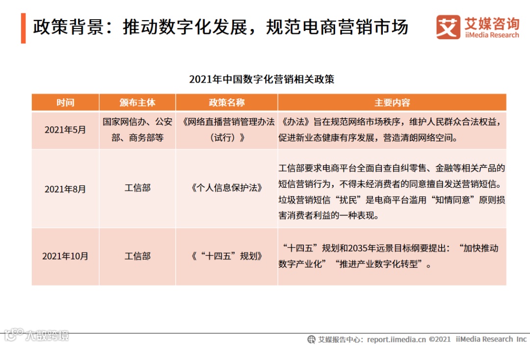 政策方面,国家“十四五”期间将加快推进企业数字化进程及产业数字化转型,推动数字化经济发展,网信办及工信部也加紧对于公民个人信息安全保护及数字化营销环境的监管。