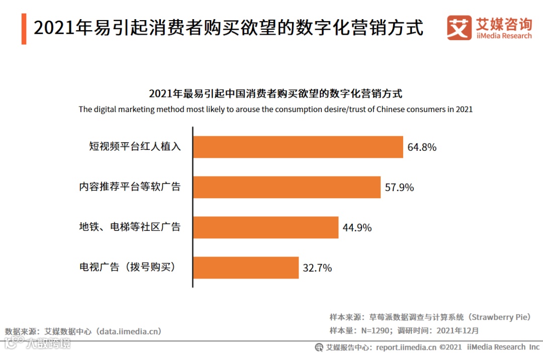 调研数据显示,中国消费者对于短视频平台红人植入及内容推荐平台内植入广告信任度较高(分别为64.8%与57.9%),微博明星代言与电视广告类较传统的营销模式对消费者购买欲刺激程度较低。